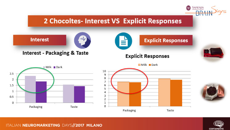 Per rendere evidente questa possibilità, durante il convegno Certamente 2017 - Italian Neuromarketing Days, quest’anno BrainSigns ha messo a disposizione dei partecipanti alcune postazioni per il testing di 4 spot o di 2 cioccolatini, registrando attività fisiologiche cerebrali e biometriche con tecnologie EEG, HR e GSR. Sono stati misurati il livello d’interesse cerebrale e il coinvolgimento emozionale dei partecipanti, e sono stati annotati i voti di gradimento dichiarati a voce da questi ultimi.