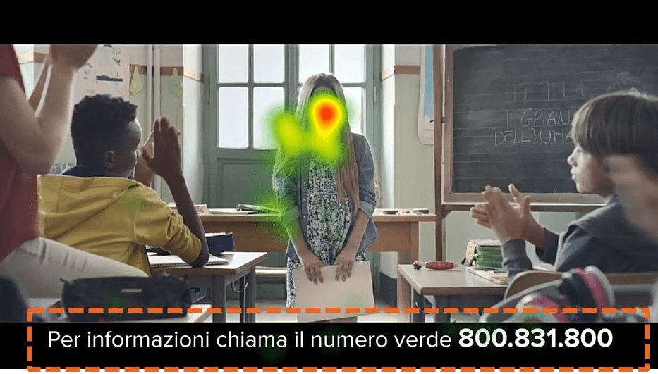 Below, we report a video heat map showing the visual attention of all participants during the whole TV commercial. Areas coloured in red indicated higher visual attention, while areas coloured in green indicated lower visual attention. What about the "Call to Action"? Watch with your eyes...