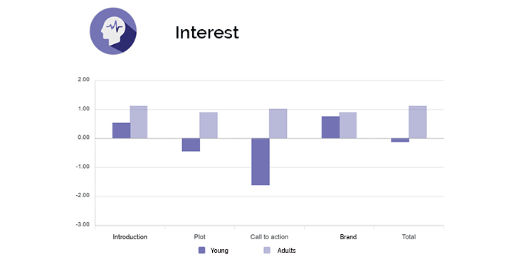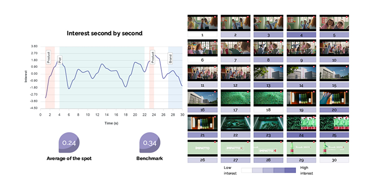 - Evaluate the effectiveness of an advertisement in terms of attention, emotion, interest and cognitive effort, for the entire communication and for segments of interest (e.g. product, claim, brand, testimonial).