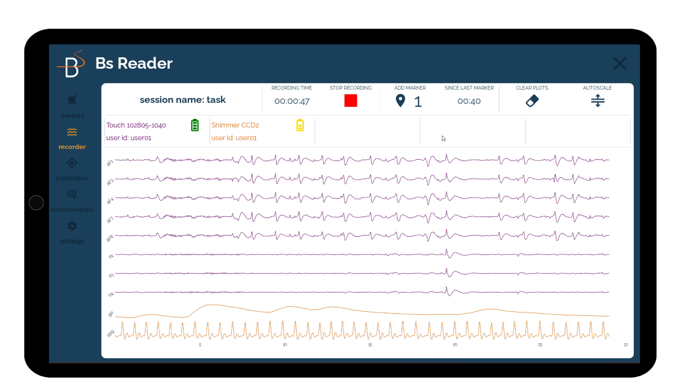 The BS Reader is a Windows® application that allows the streaming and the recording of bio-signals from multiple devices simultaneously as well as the calculation of neurometrics for workload, stress, and vigilance in real time. It handles the connection with the devices, their configuration and the synchronization between them.